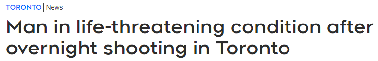 来源链接:https://www.cp24.com/news/one-person-in-life-threatening-condition-following-mississauga-shooting-1.6180286 https://www.cp24.com/news/peel-police-searching-for-suspect-after-woman-fatally-shot-overnight-outside-mississauga-gas-station-1.6180259 https://toronto.ctvnews.ca/man-in-life-threatening-condition-after-overnight-shooting-in-toronto-1.6179624 https://www.yorkregion.com/news-story/10804334-man-in-life-threatening-condition-after-suspected-robbery-shooting-in-richmond-hill/ https://globalnews.ca/news/9323553/elgin-404-shooting-richmond-hill/