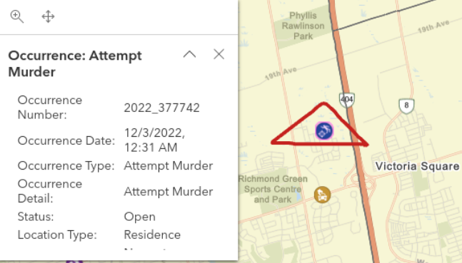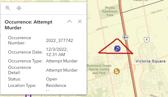 据约克区警方公开的社区安全实时数据统计图显示,此次枪案发生在华人聚居区,西南方向是名校Richmond Green高中,南边是以Costco和Home Depot为中心的购物Plaza。