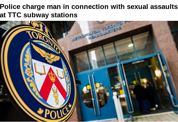 一名男子因涉嫌在10月份期间于多个不同的TTC地铁站内暴露自己并 性侵略数名女子,被警方逮捕并控罪。