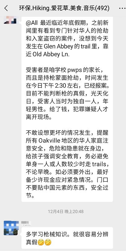 网友在微信群留言说:最近临近年底假期,之前新闻里有看到专门针对华人的抢劫和入室盗窃的案件,没想到今天发生在Glen Abbey的trail里,靠近Old Abbey Ln。