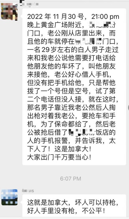 最近几天,有华人网友在微信群爆料称遭人持枪抢劫,慨叹加拿大治安每况愈下,提醒其他网友多加小心,尽量避免单独出行。