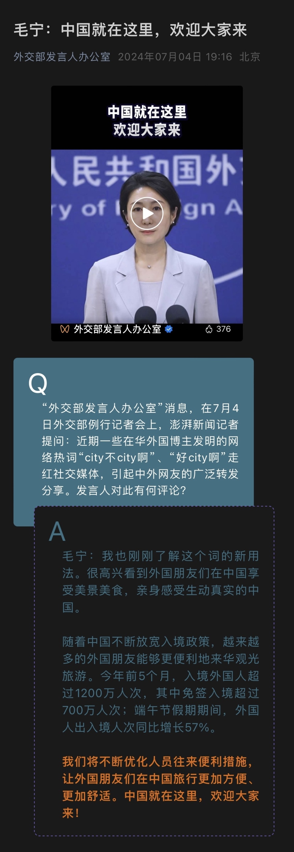 今年以来,随着免签“朋友圈”的不断扩容以及144小时过境免签政策的加持,越来越多的外国游客来到中国旅游,“China Travel”火爆全球社交媒体,外国博主“保保熊”与妹妹的“魔性”对话“city不city”热梗也火爆全网。