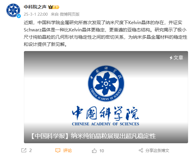中国科学院首次发现纳米尺度下 Kelvin 晶体,颠覆金属稳定性认知.Chinese Academy of Sciences discovers Kelvin crystals at the nanoscale for the first time, upending the perception of metal stability