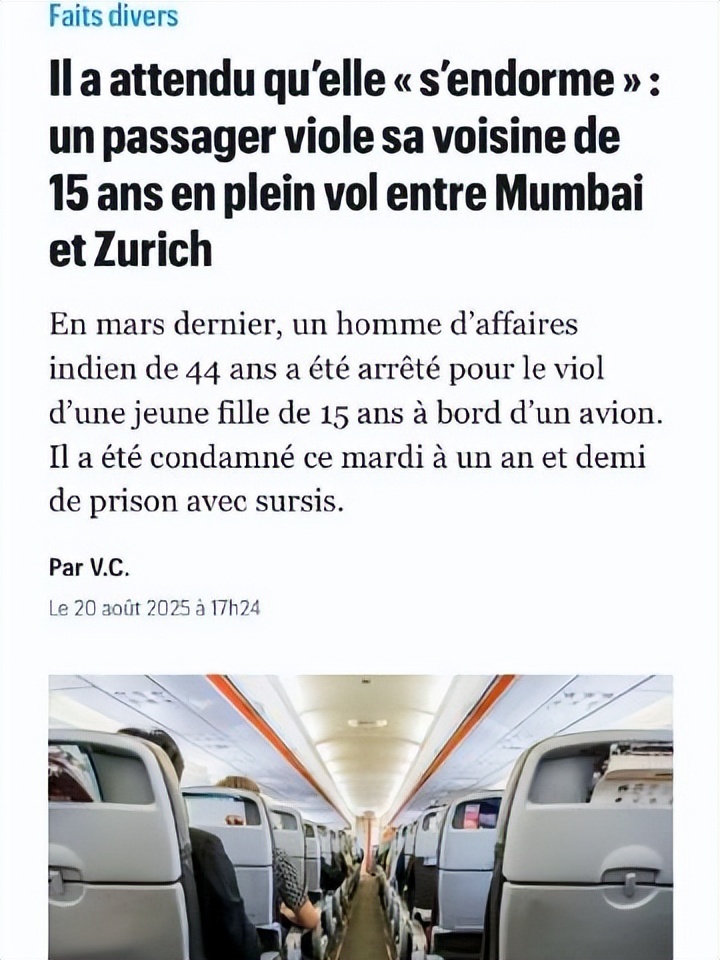 印度男子飞瑞士航班上强奸15岁女孩,在瑞士获缓刑.Indian man rapes 15-year-old girl on flight to Switzerland, receives suspended sentence in Switzerland